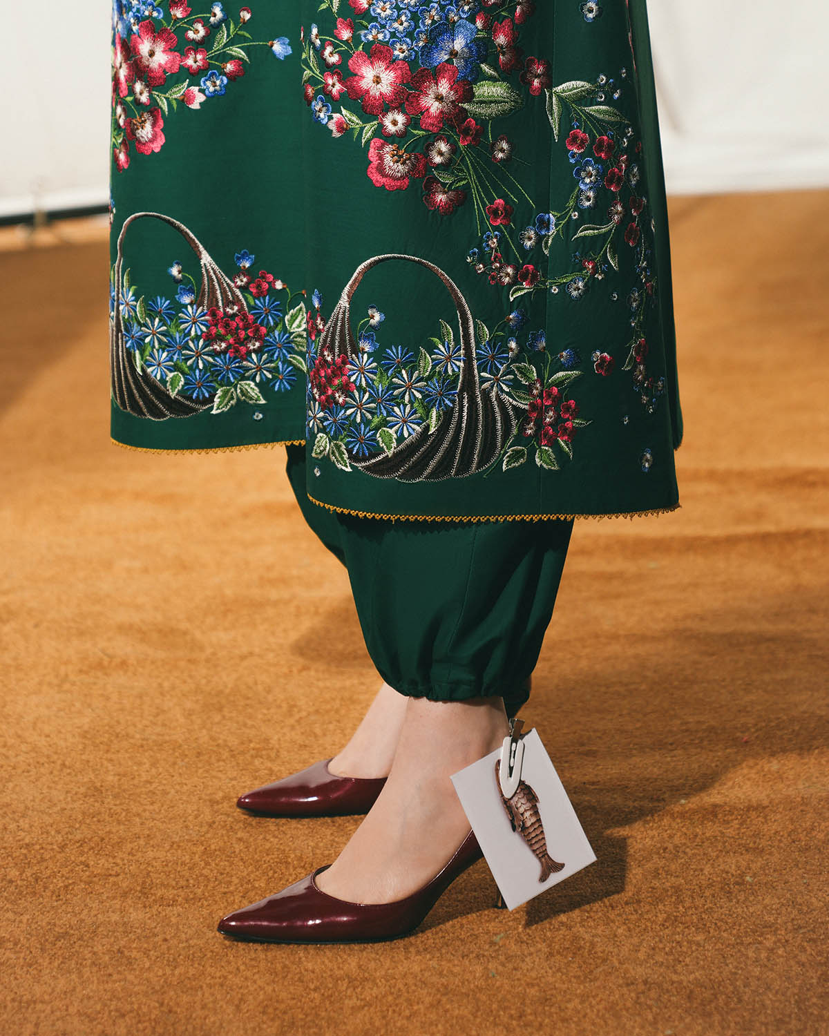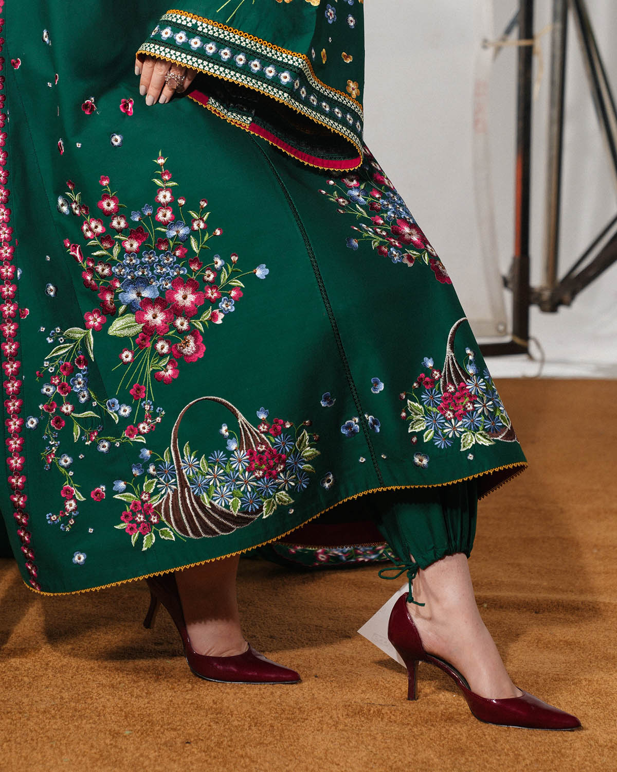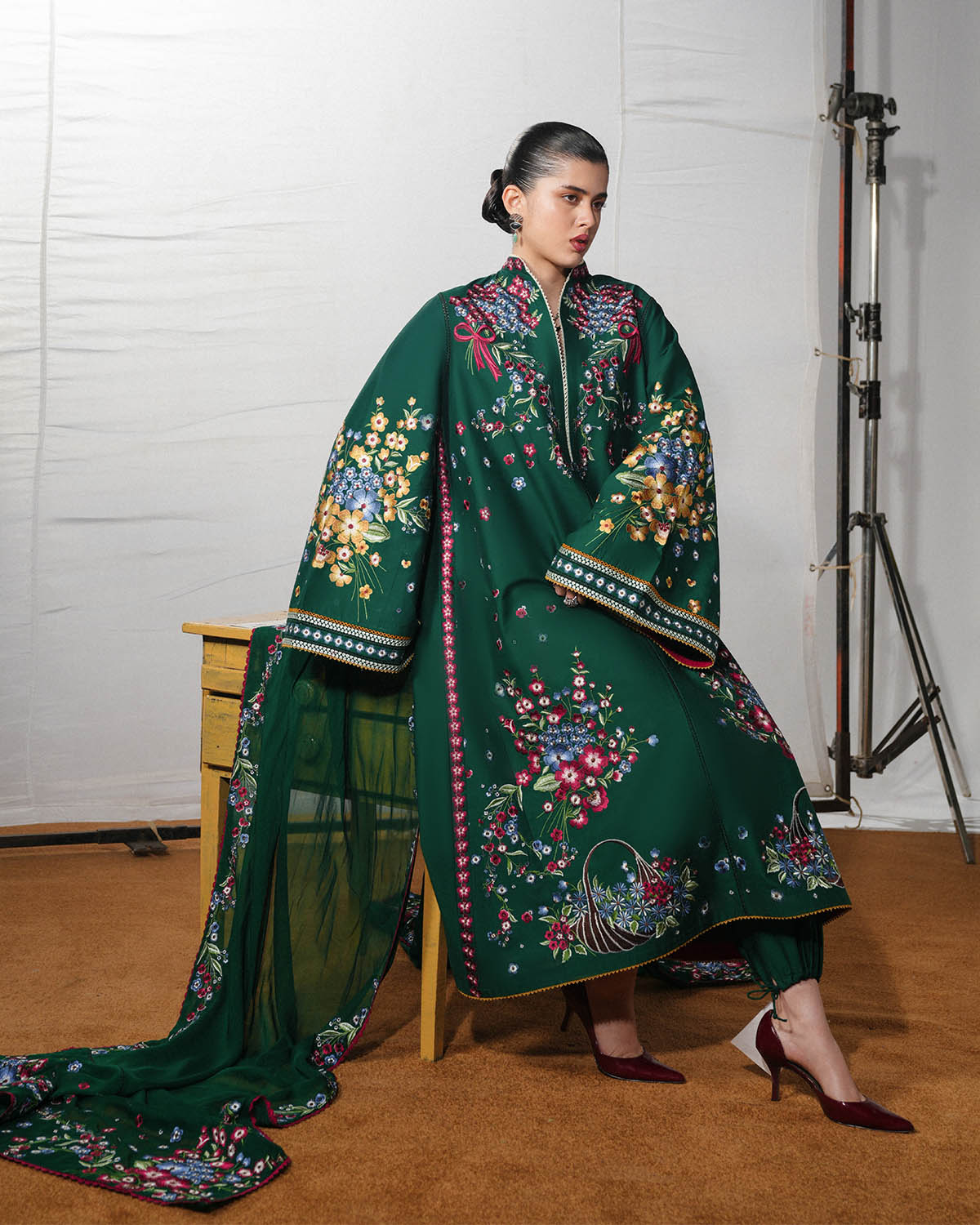 A long green shirt adorned with multicolor floral embroidery is elegantly complemented by bell sleeves featuring matching embroidered borders, creating a refined and graceful silhouette. The ensemble is paired with green dyed harem pants that offer fluidity and comfort, while a multicolor floral-embroidered chiffon dupatta adds a delicate, sophisticated finishing touch.