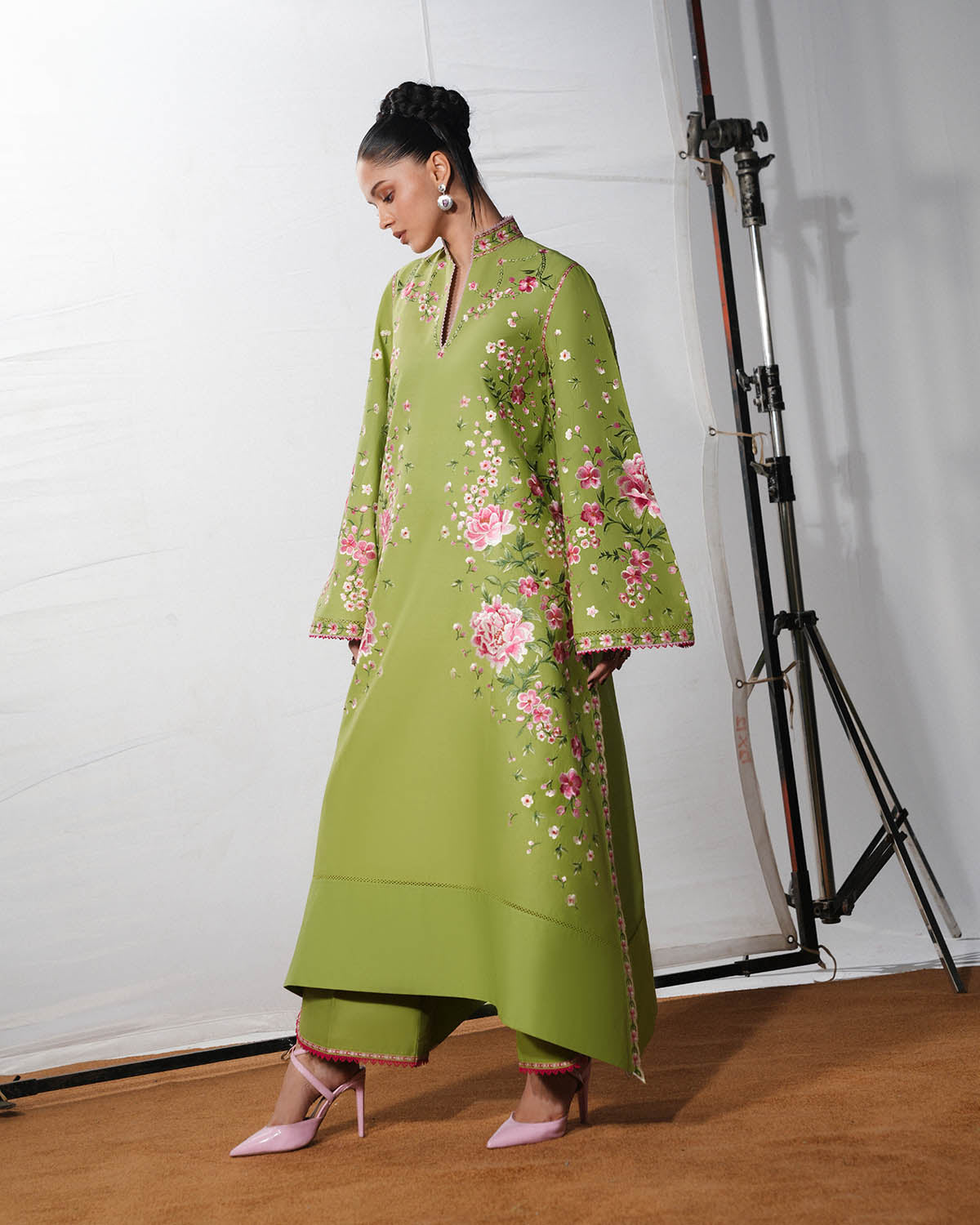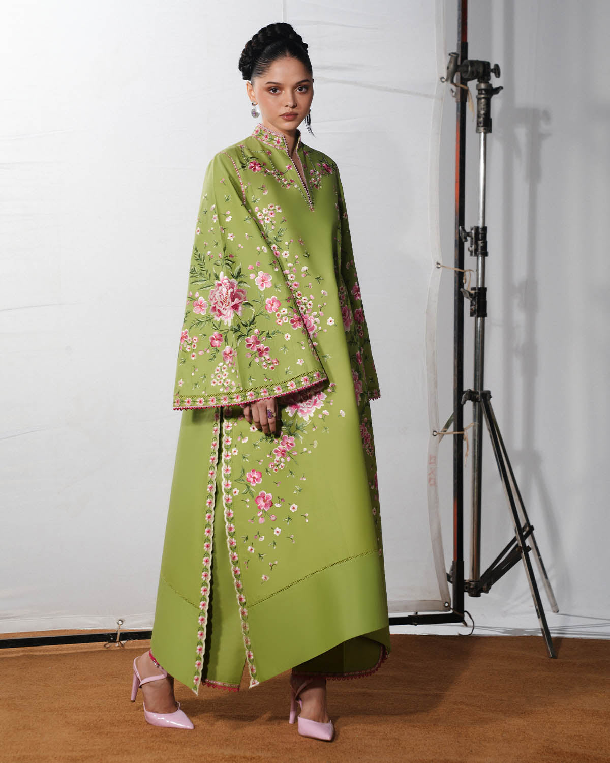 A long mint green shirt adorned with delicate floral embroidery and structured panels is complemented by matching embroidered bell sleeves, creating an elegant and graceful silhouette. The ensemble is paired with mint green dyed culottes featuring embroidered borders, while a digital printed silk dupatta completes the look with a sophisticated, timeless finish.