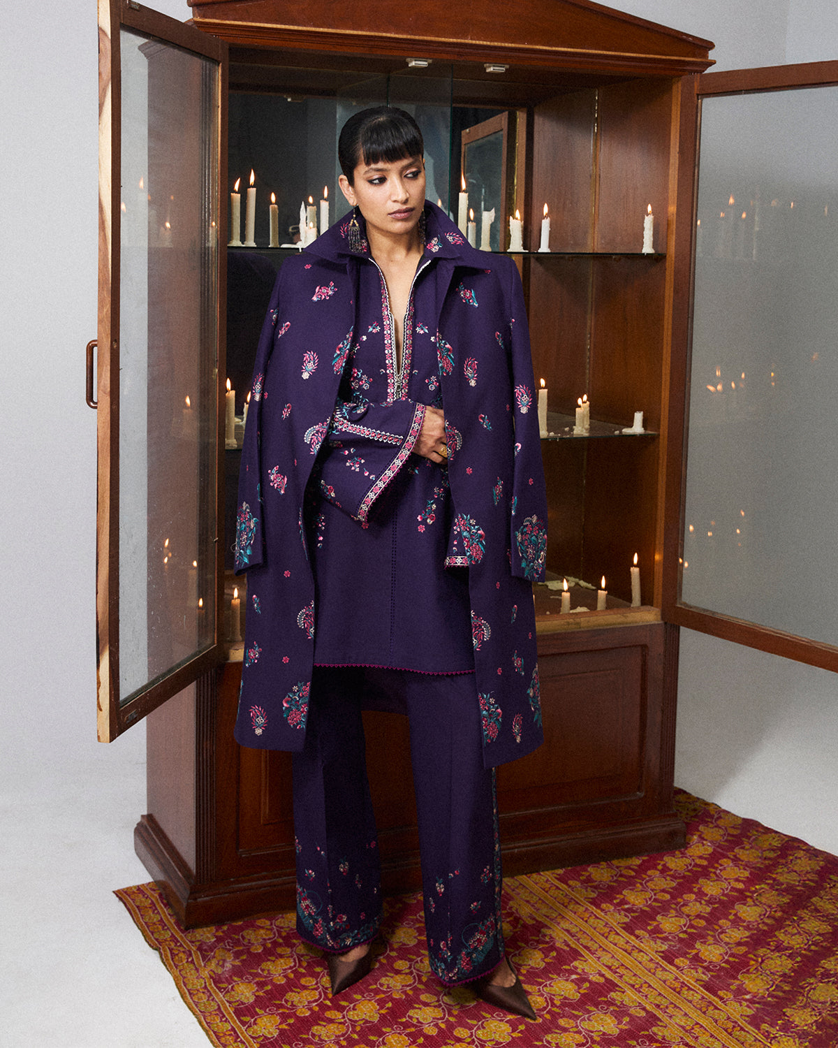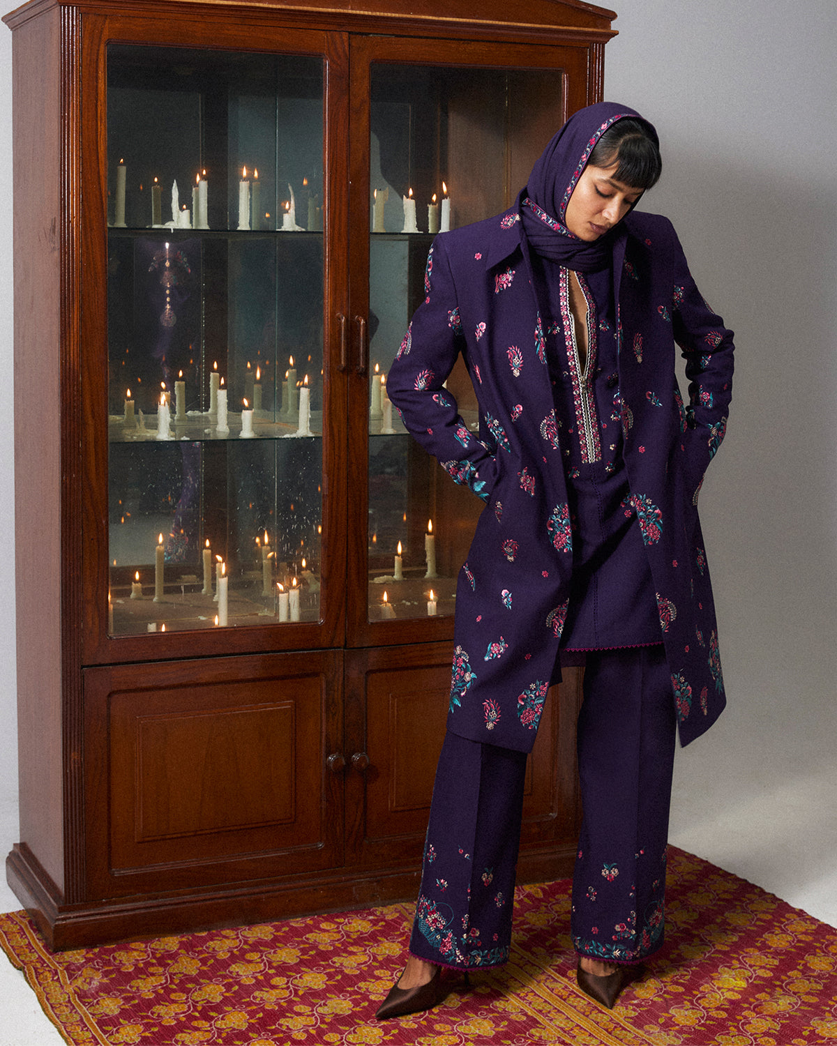 Description: A purple collared short shirt, richly adorned with multicoloured Persian embroidery on the sleeves, front, and back, featuring a sleek front zipper. Paired with matching bootcut trousers embroidered along the side seams and a coordinating purple scarf, the ensemble blends vibrant tradition with modern elegance.