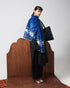 Description: A refined black long-sleeved shirt, richly adorned with intricate multicoloured ghara embroidery across the front, back, and sleeves. It is paired with black straight trousers that lend structure and elegance to the silhouette, and completed with a striking electric blue scarf, beautifully detailed with traditional multicoloured embroidery for a vibrant yet balanced finish.