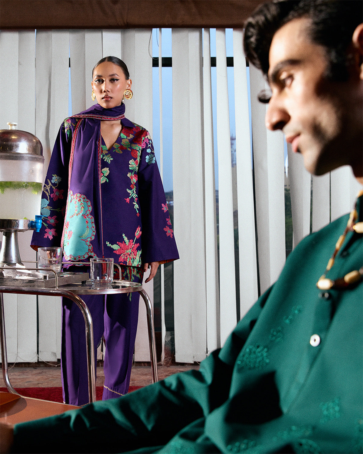Description: This purple co-ord makes a confident statement with all-over floral embroidery. The short shirt and fitted pants share the same vibrant threadwork, while the sleeves offer added texture. A traditionally embroidered matching scarf ties the entire look together with richness and depth.