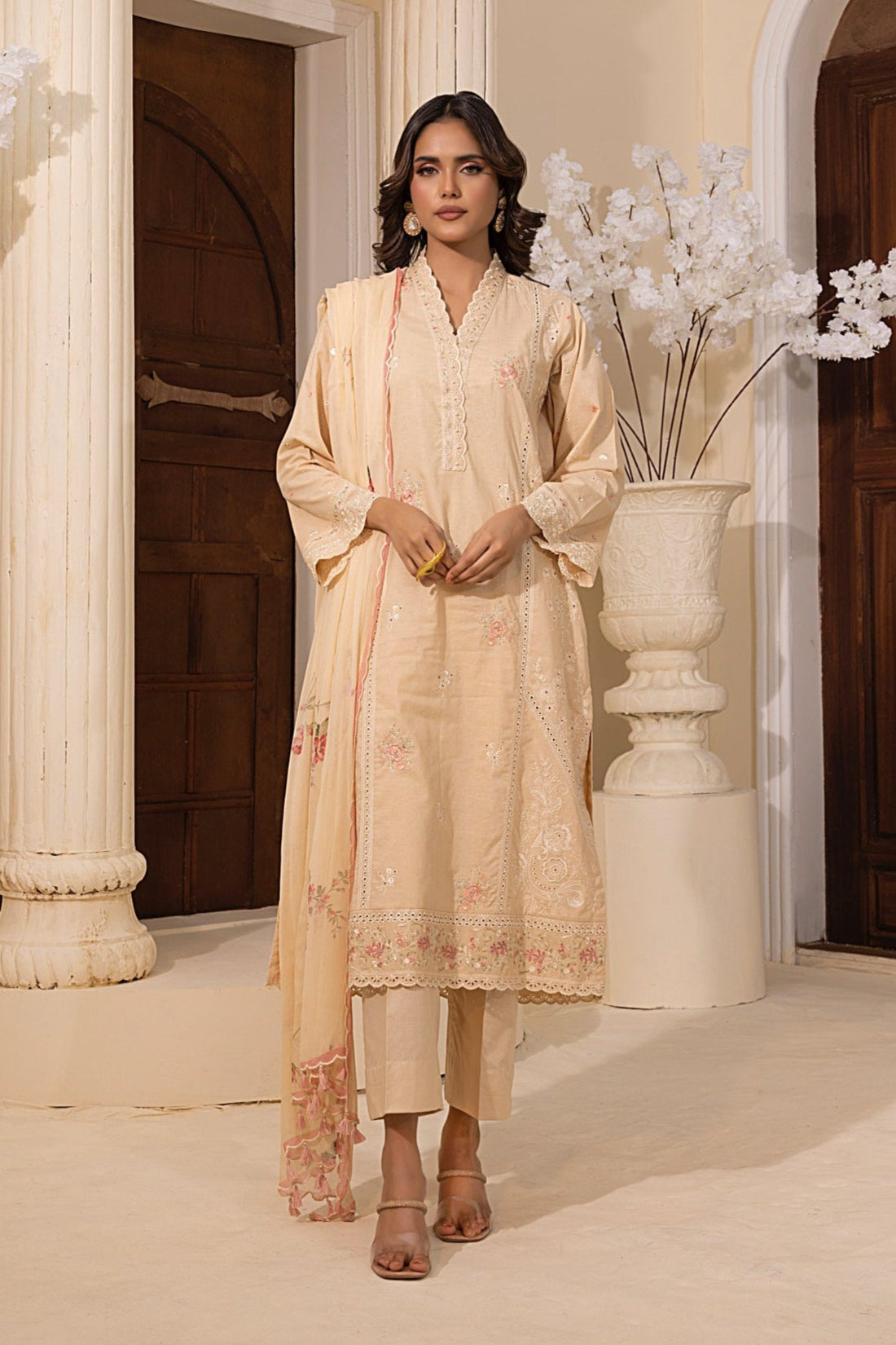 03 Piece Unstitched Embroidered with cutwork embroidered chiffon dupatta