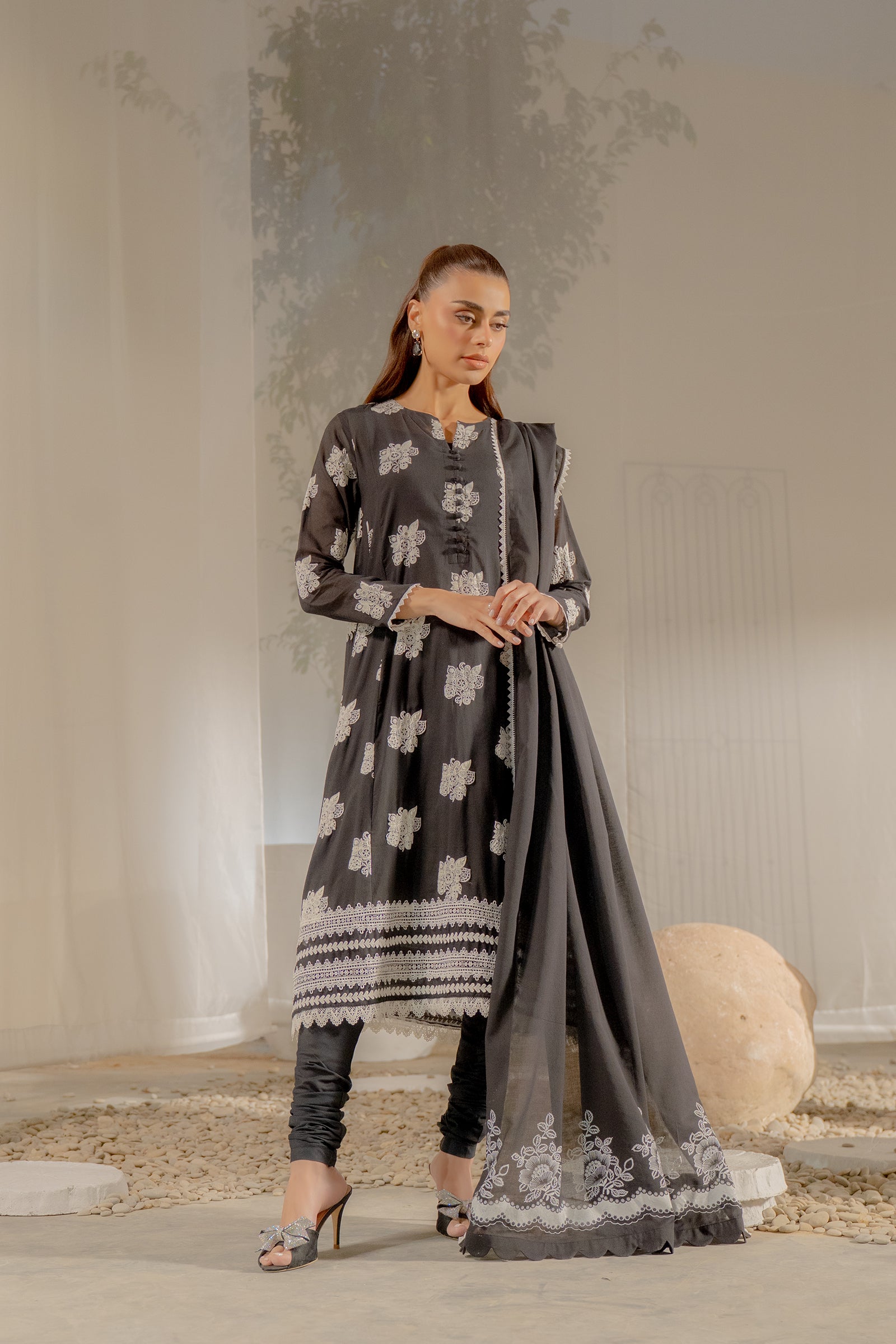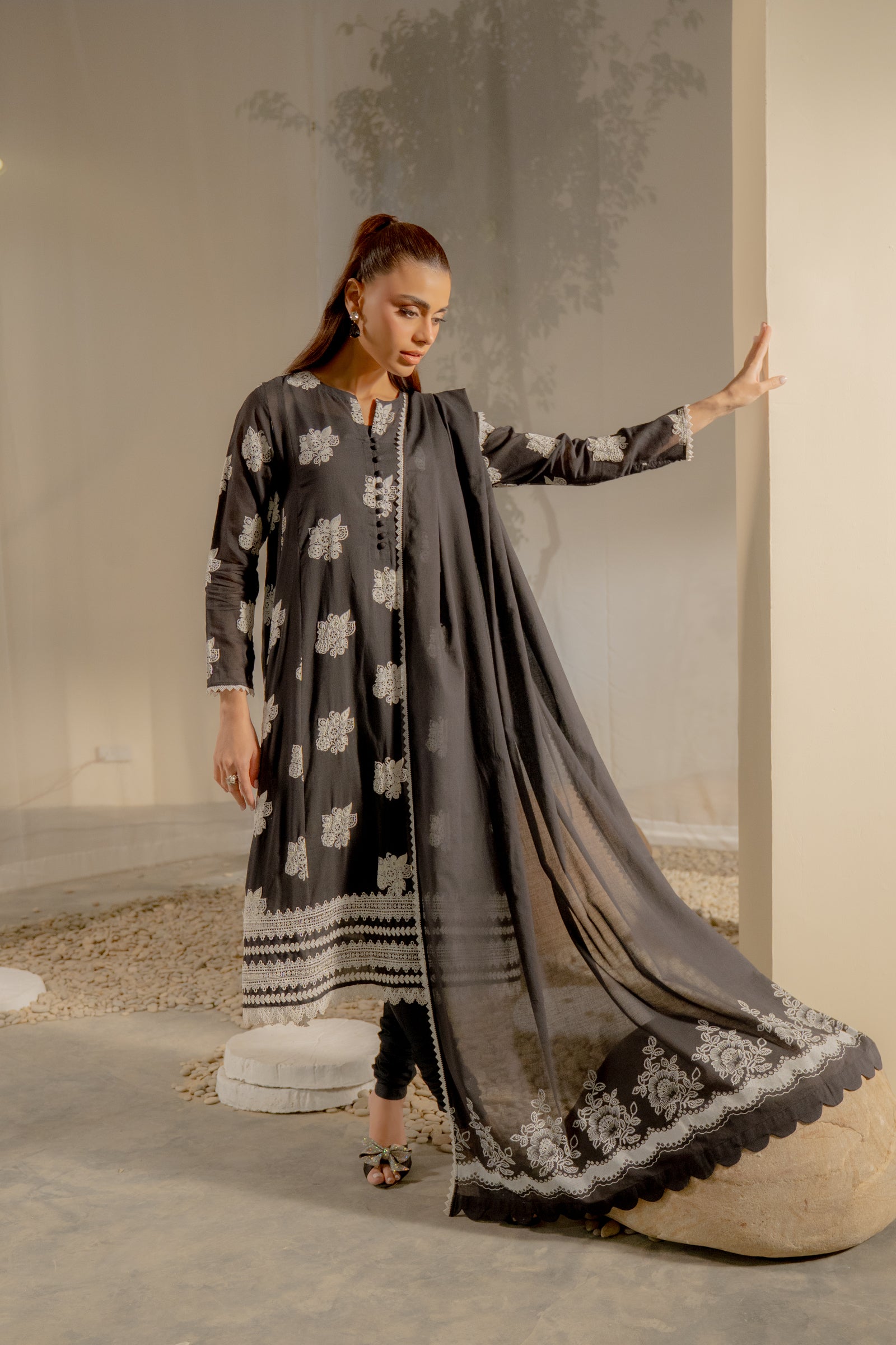A striking black luxury ensemble adorned with puff print paired with a churidar and a richly print dupatta. Elegant, bold, and perfect for sophisticated evening wear.