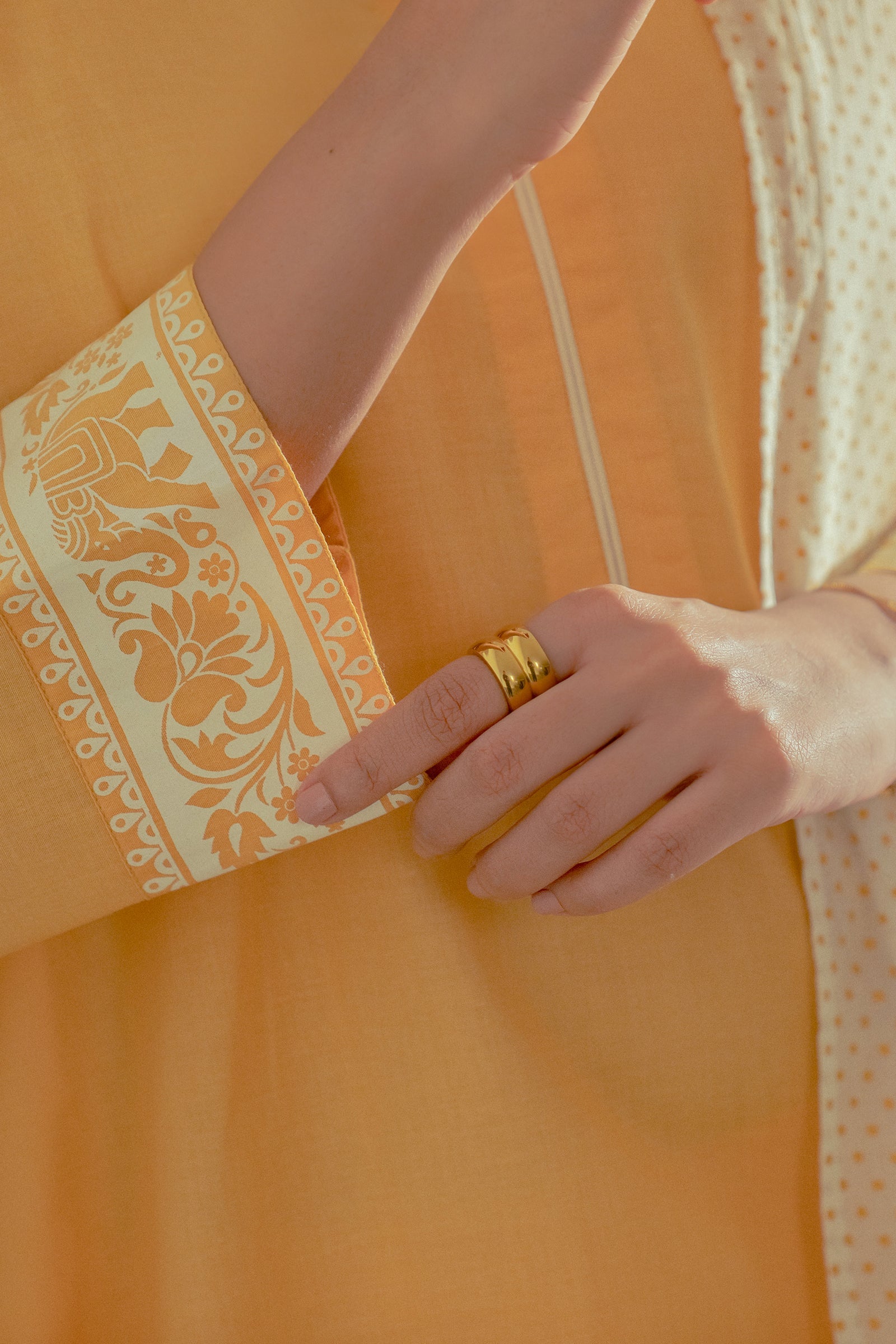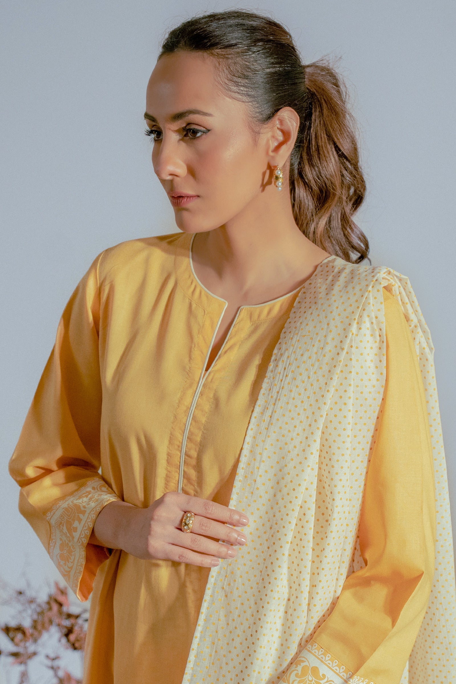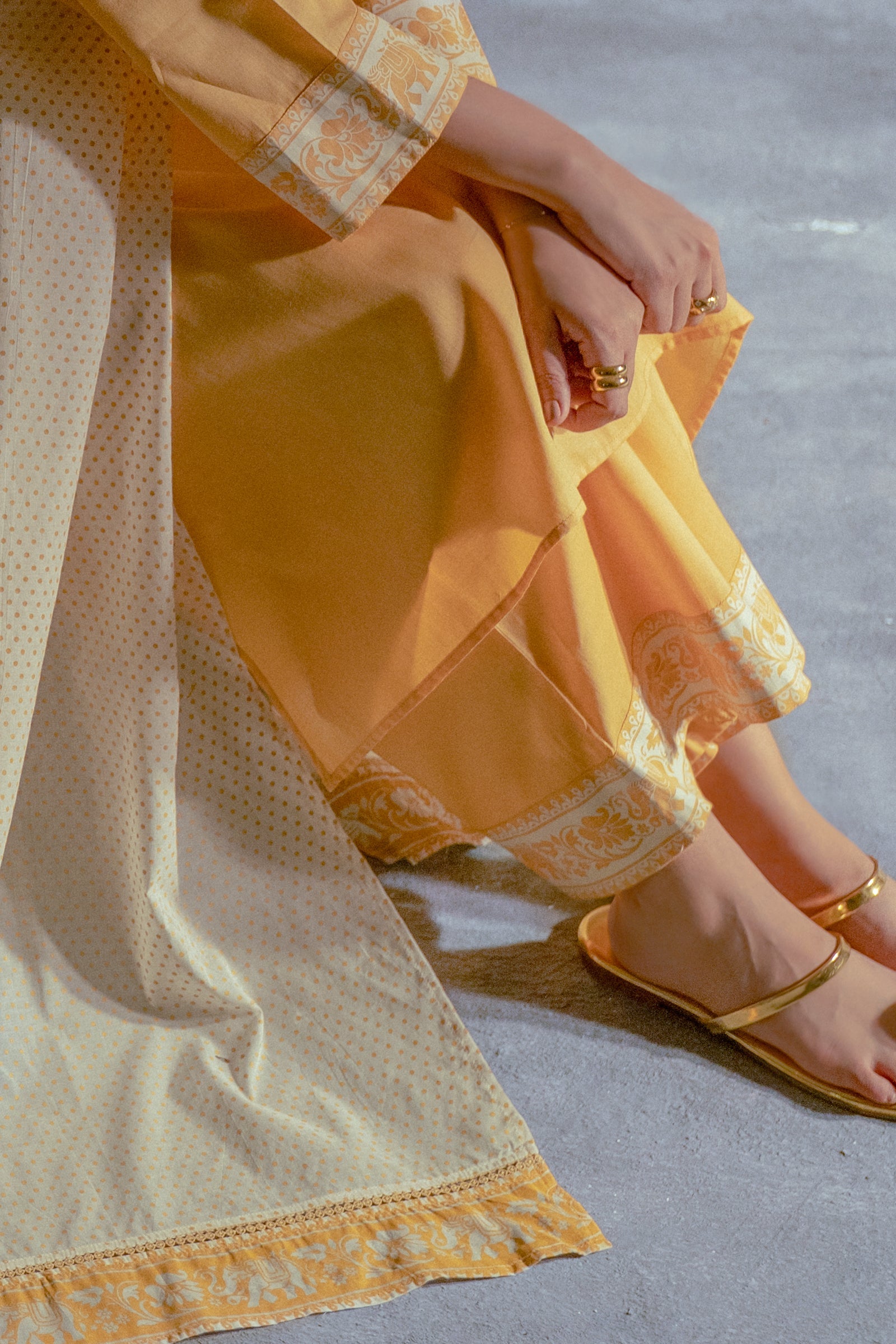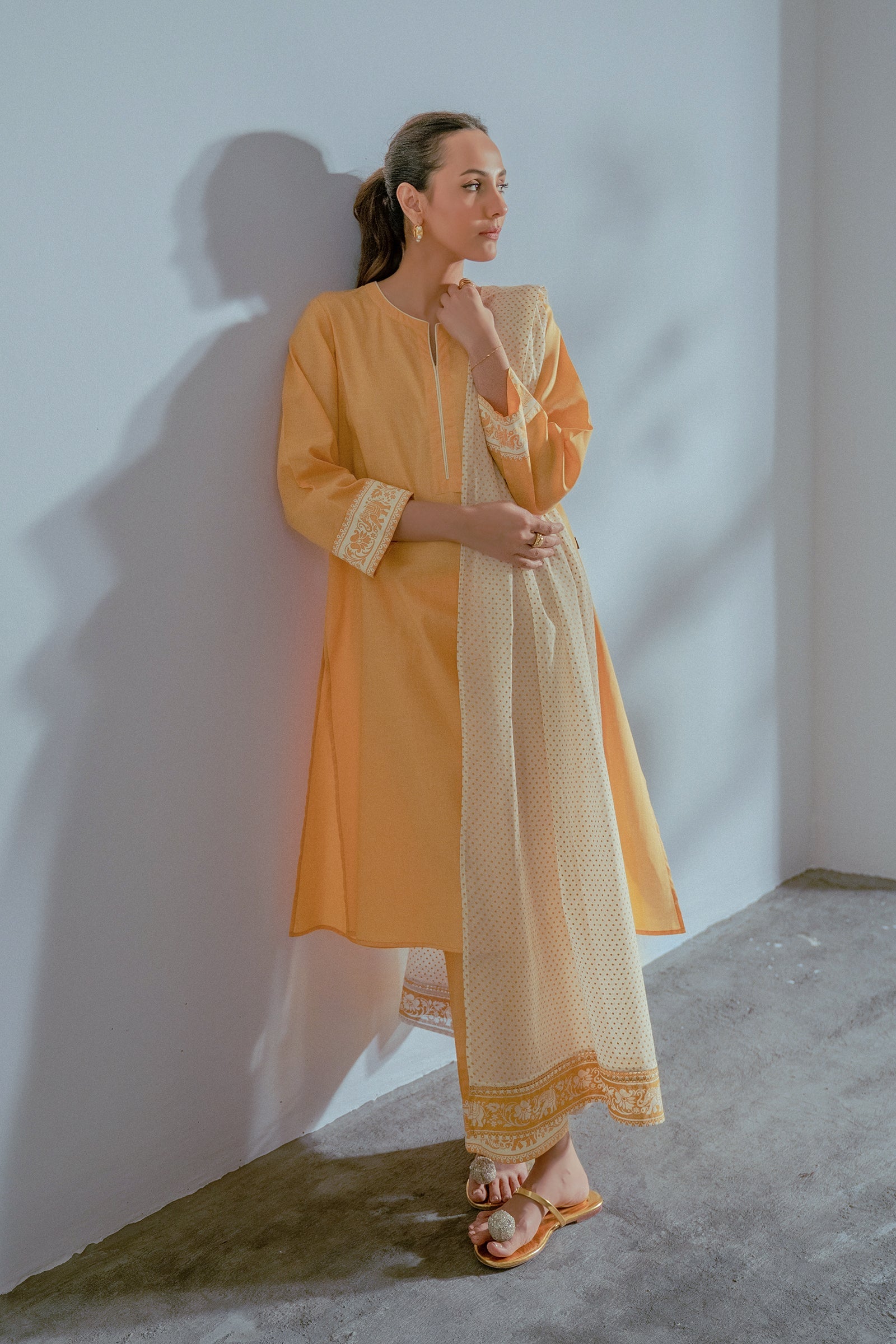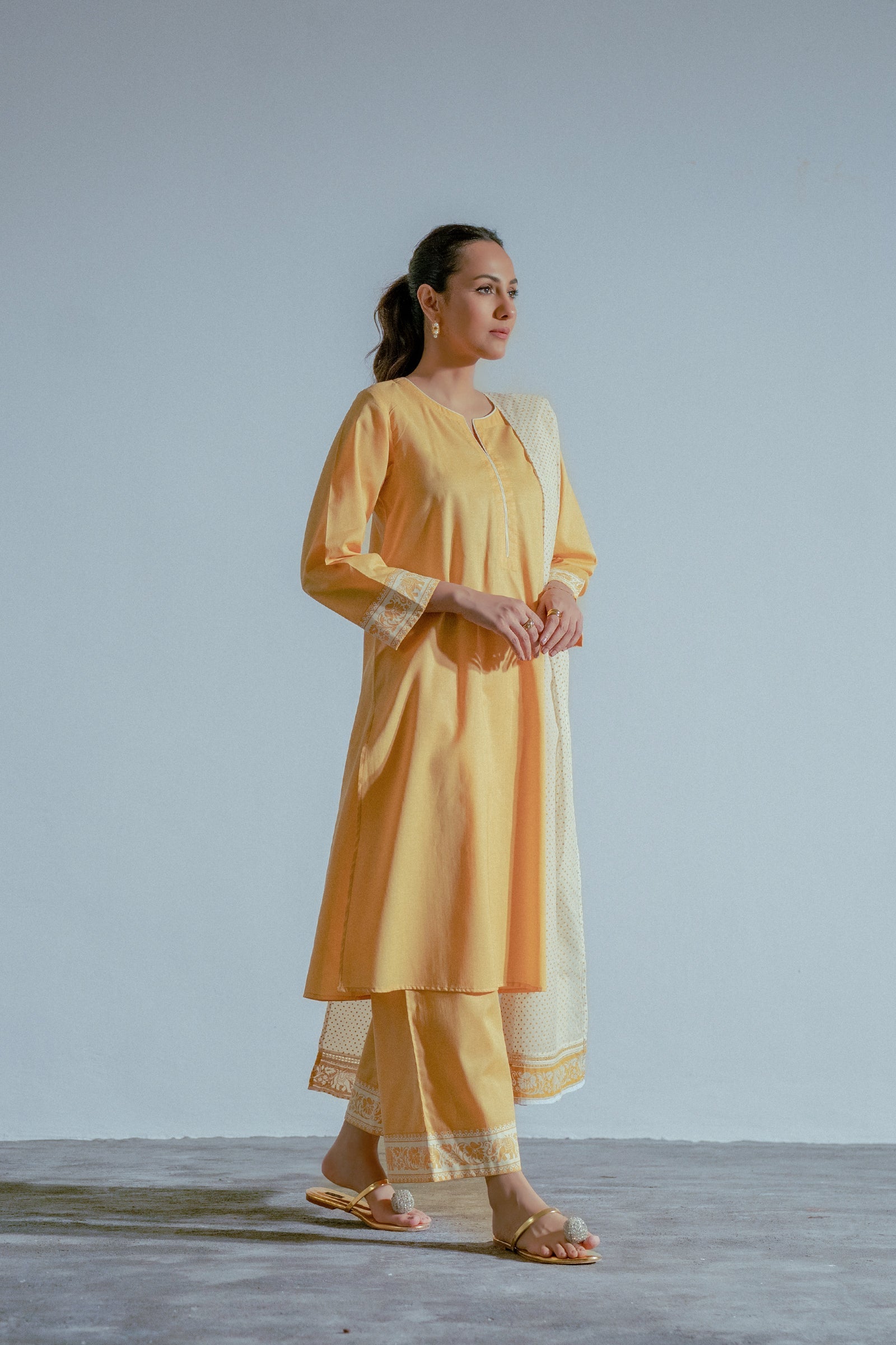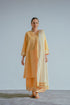 This mustard yellow three-piece set featuring a straight kurta with minimal hand screen print on the sleeves, culottes , and a printed white dupatta for a refined, elegant look.