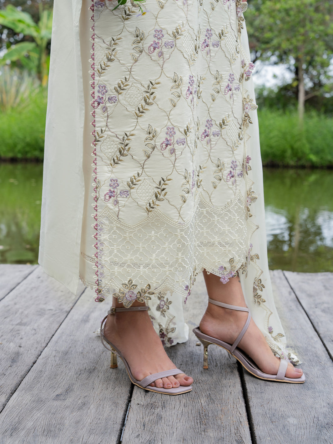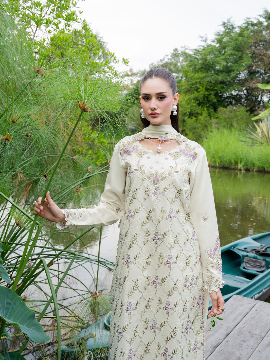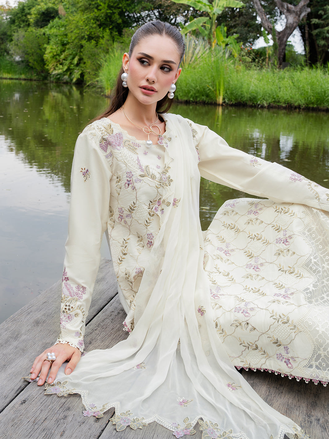 Whisper lives up to its name with pastel embroidery gently scattered across a light lawn base. Finished with embroidered organza details along the neckline and daman, and paired with a chiffon dupatta, this ensemble feels serene, fresh, and effortlessly elegant.