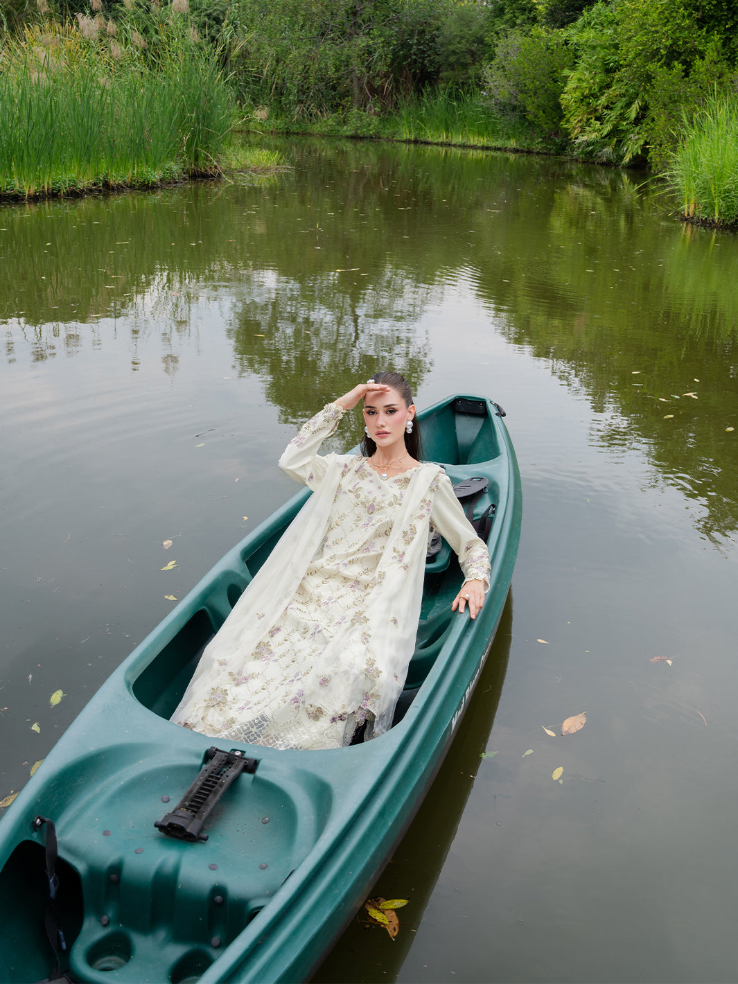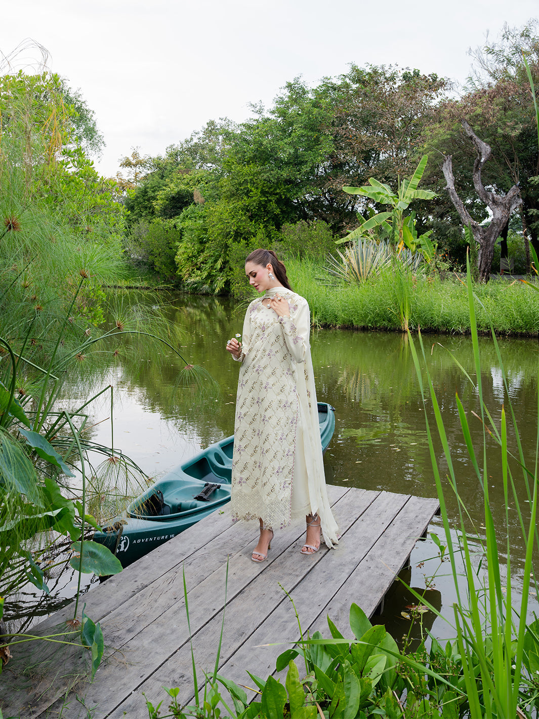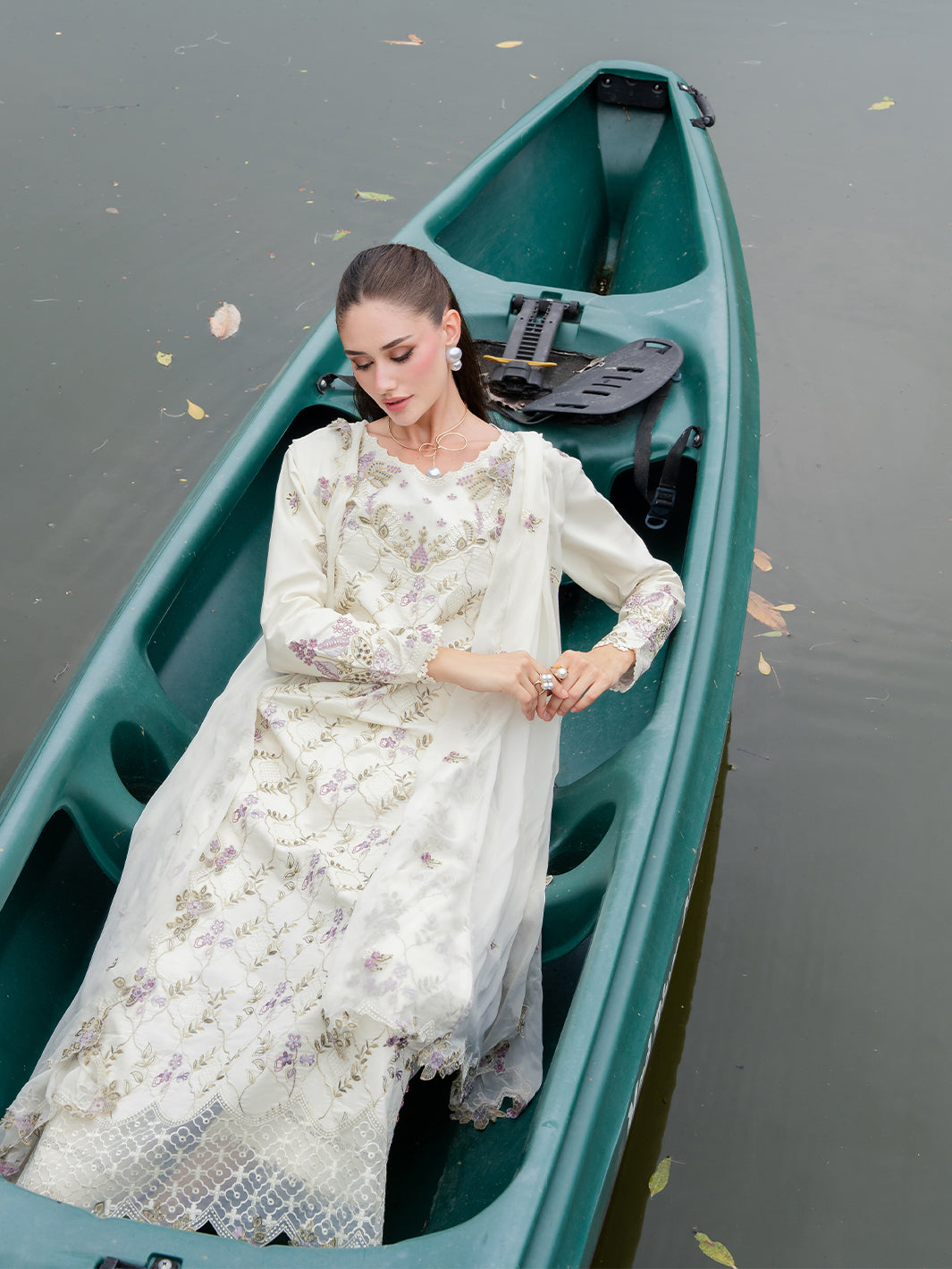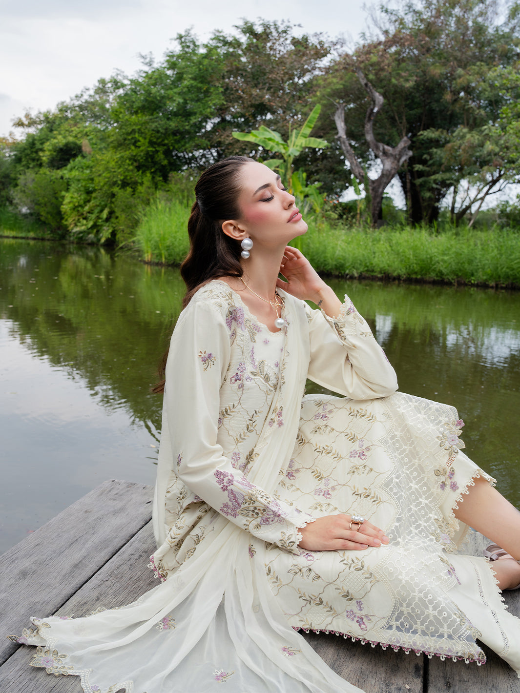 Whisper lives up to its name with pastel embroidery gently scattered across a light lawn base. Finished with embroidered organza details along the neckline and daman, and paired with a chiffon dupatta, this ensemble feels serene, fresh, and effortlessly elegant.