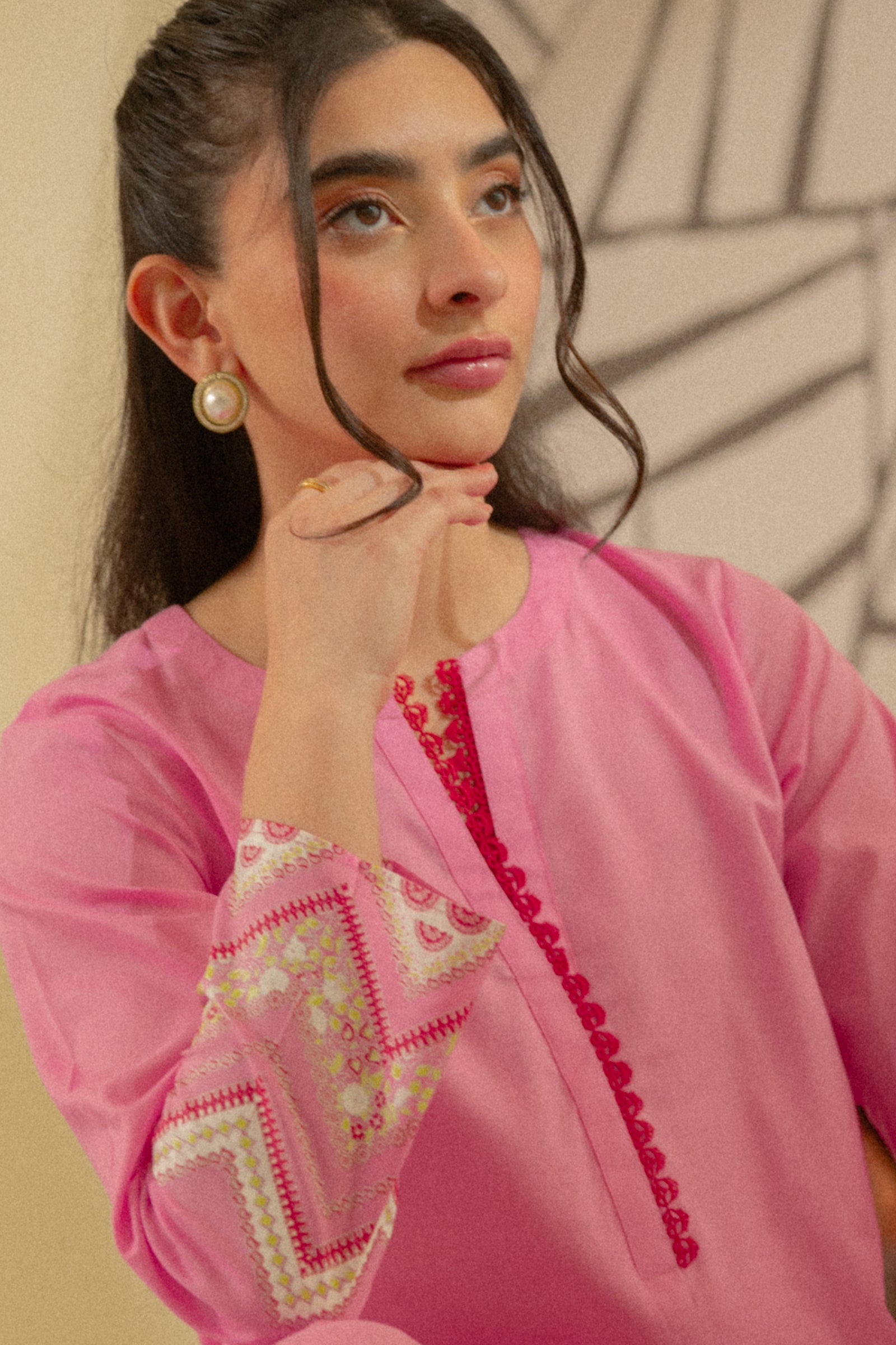 This pink colored kurta and sleek shalwar with hand screen print will keep you sorted all day.