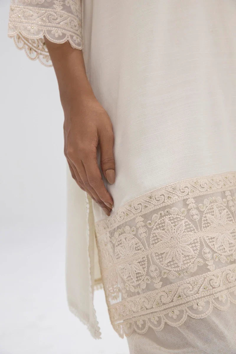 Description: A sumptuous off-white look on slub linen fabric with intricate detailing.
