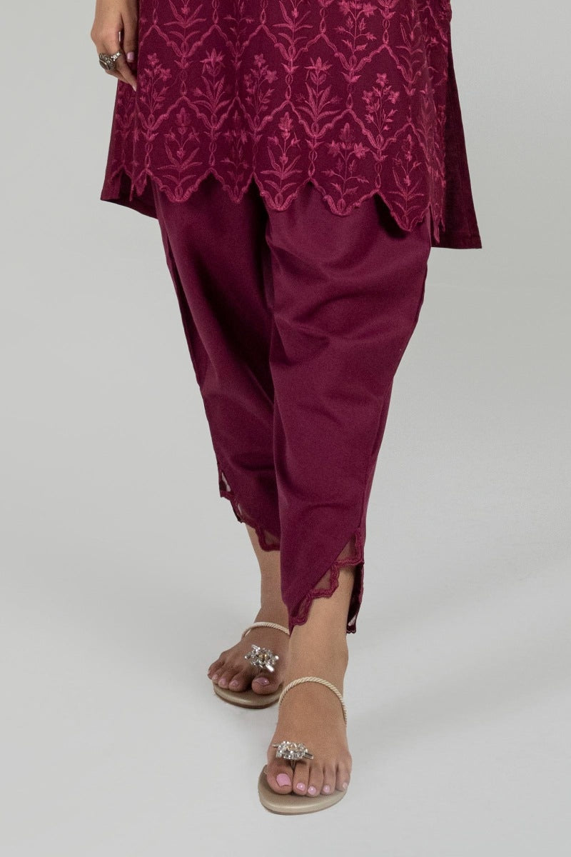 Description: Burgundy tulip shalwar on cotton tencel fabric