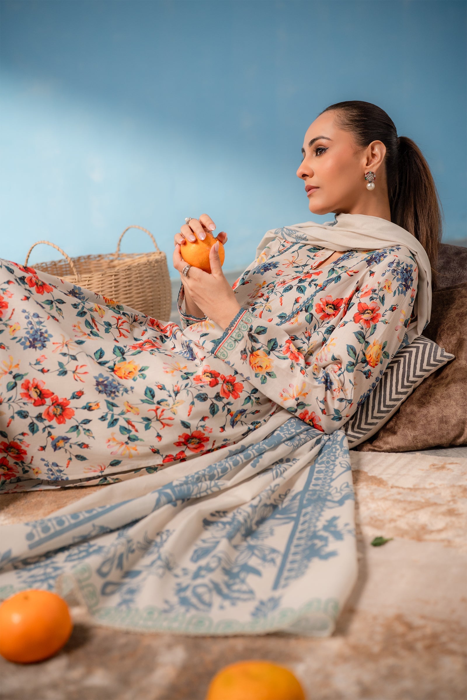 Elevate your sprint wardrobe with this beige colored three-piece unstitched with breezy floral digital print.