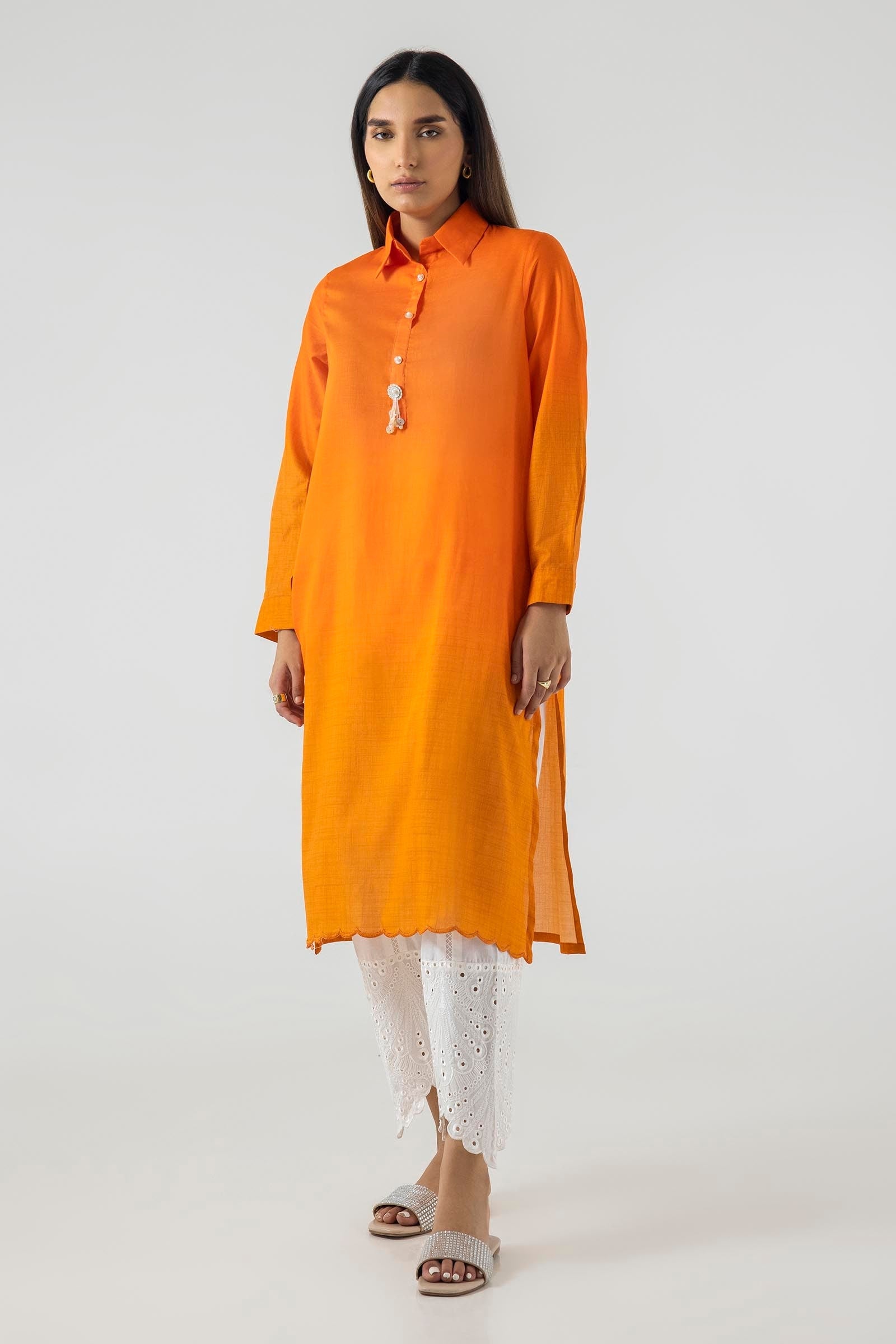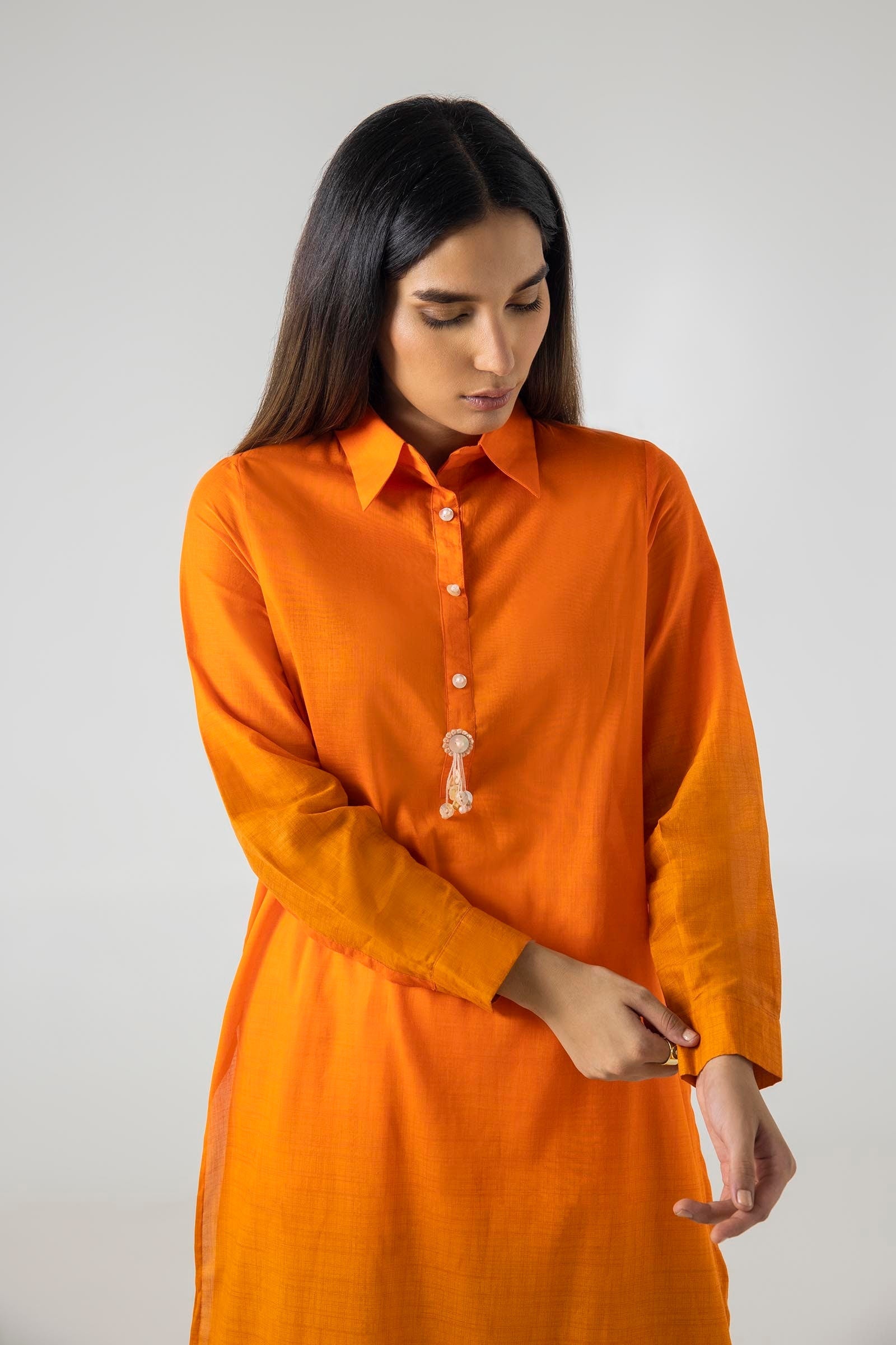 Description: This collared deep-orange ensemble has pearly buttons that add a formal touch.