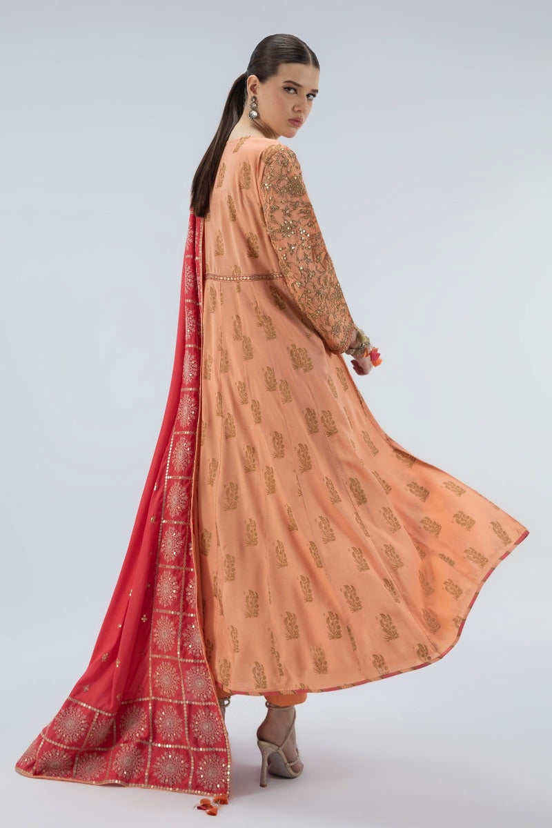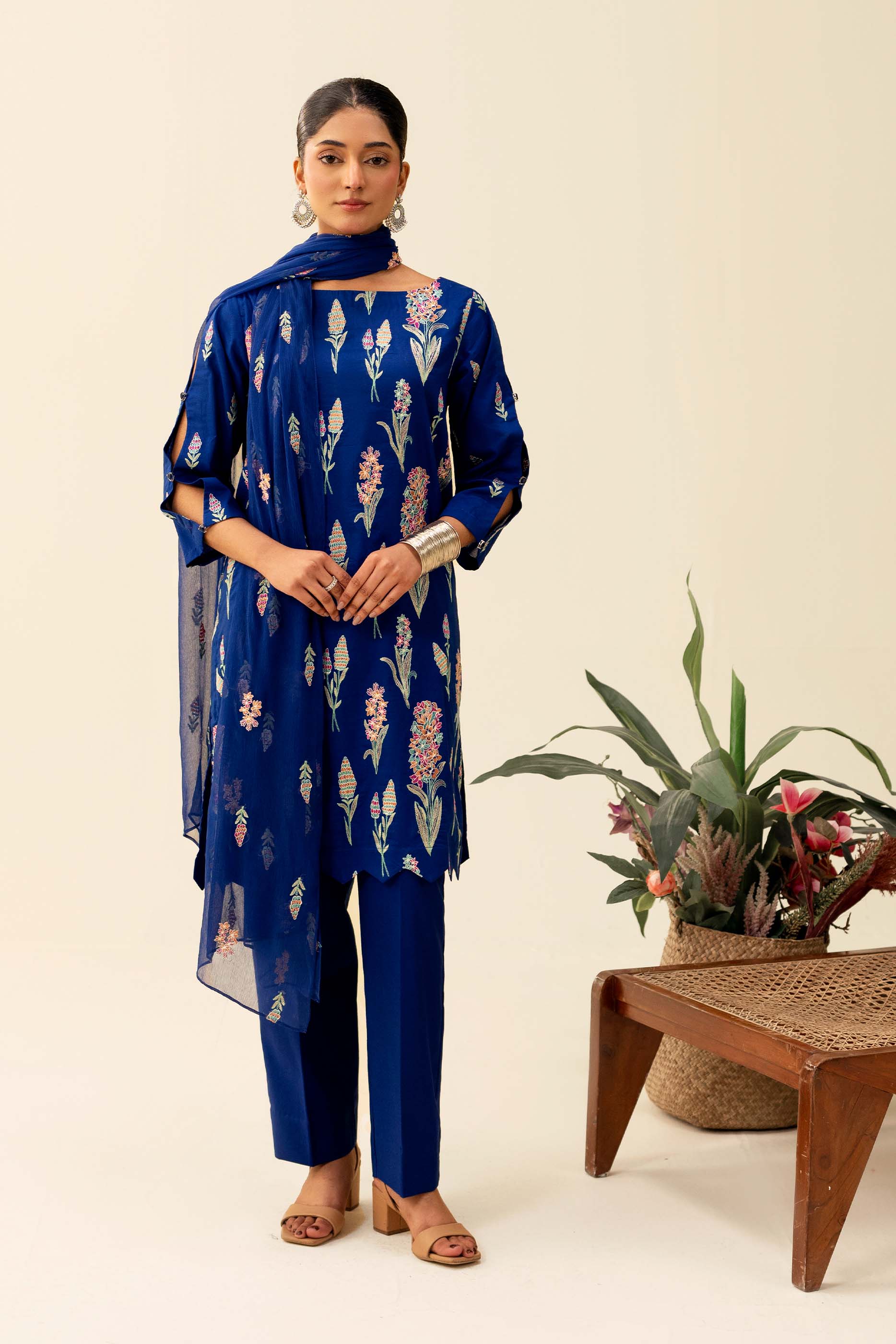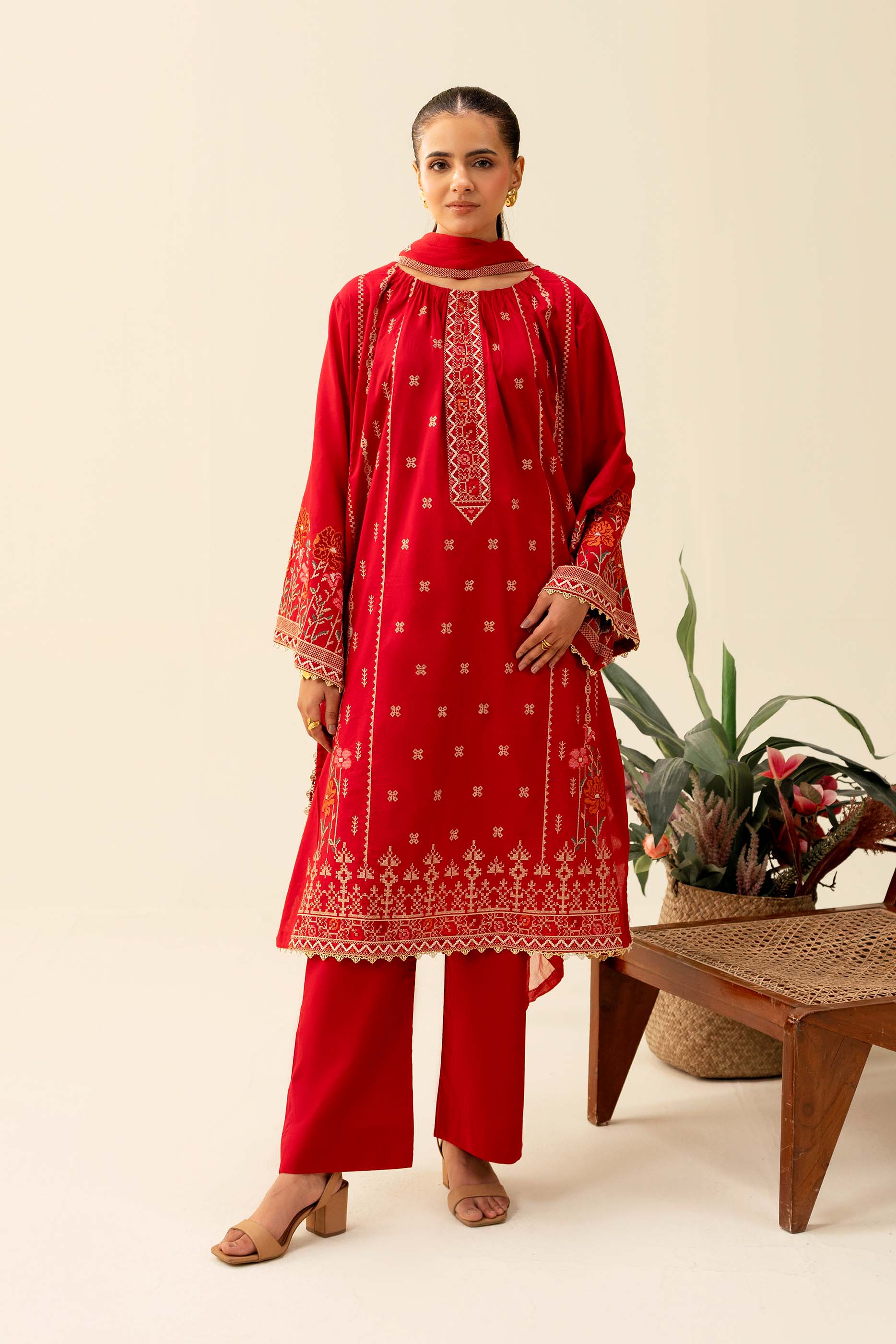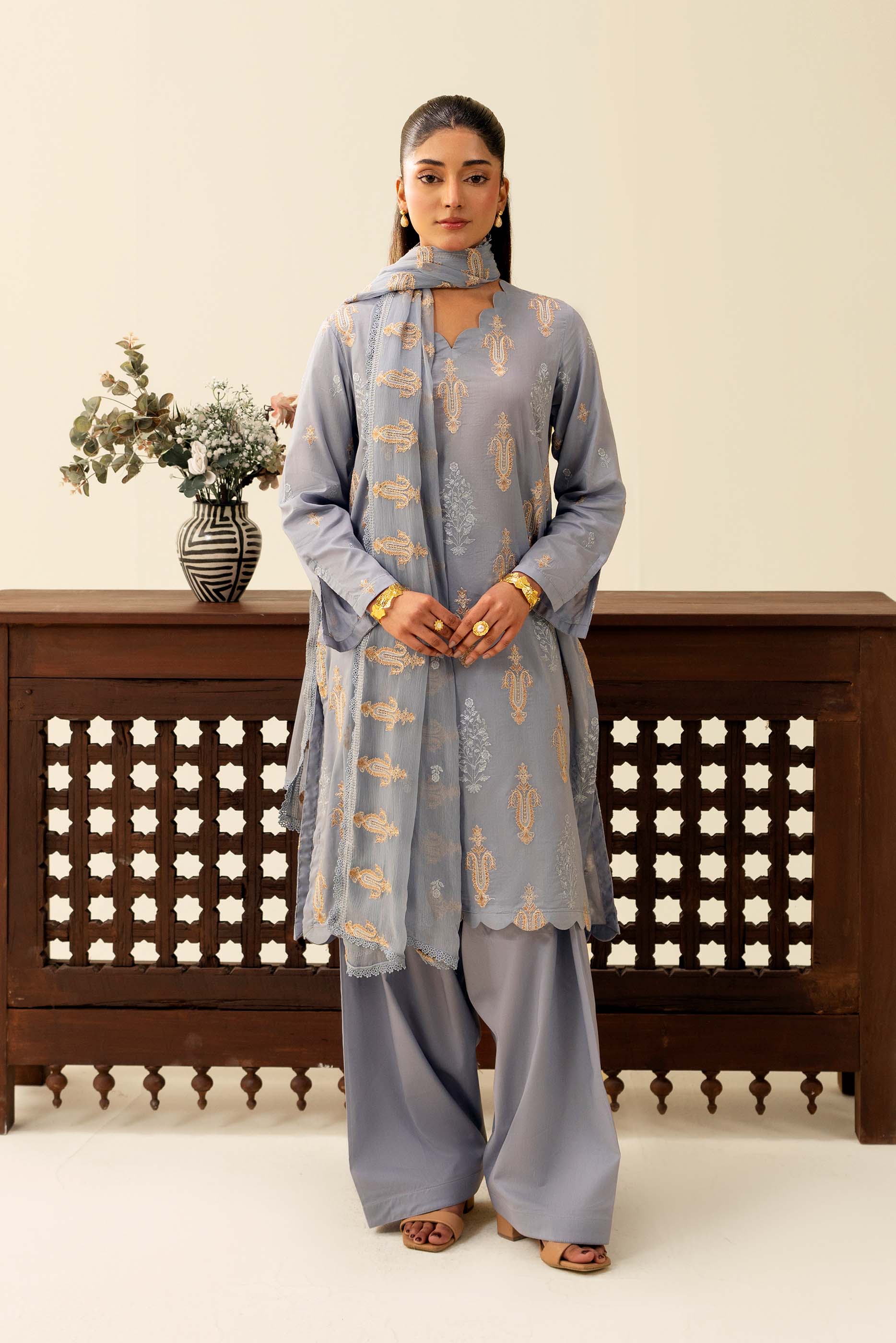 Stitched Embroidered Raw Silk Shirt + Shalwar + Dupatta