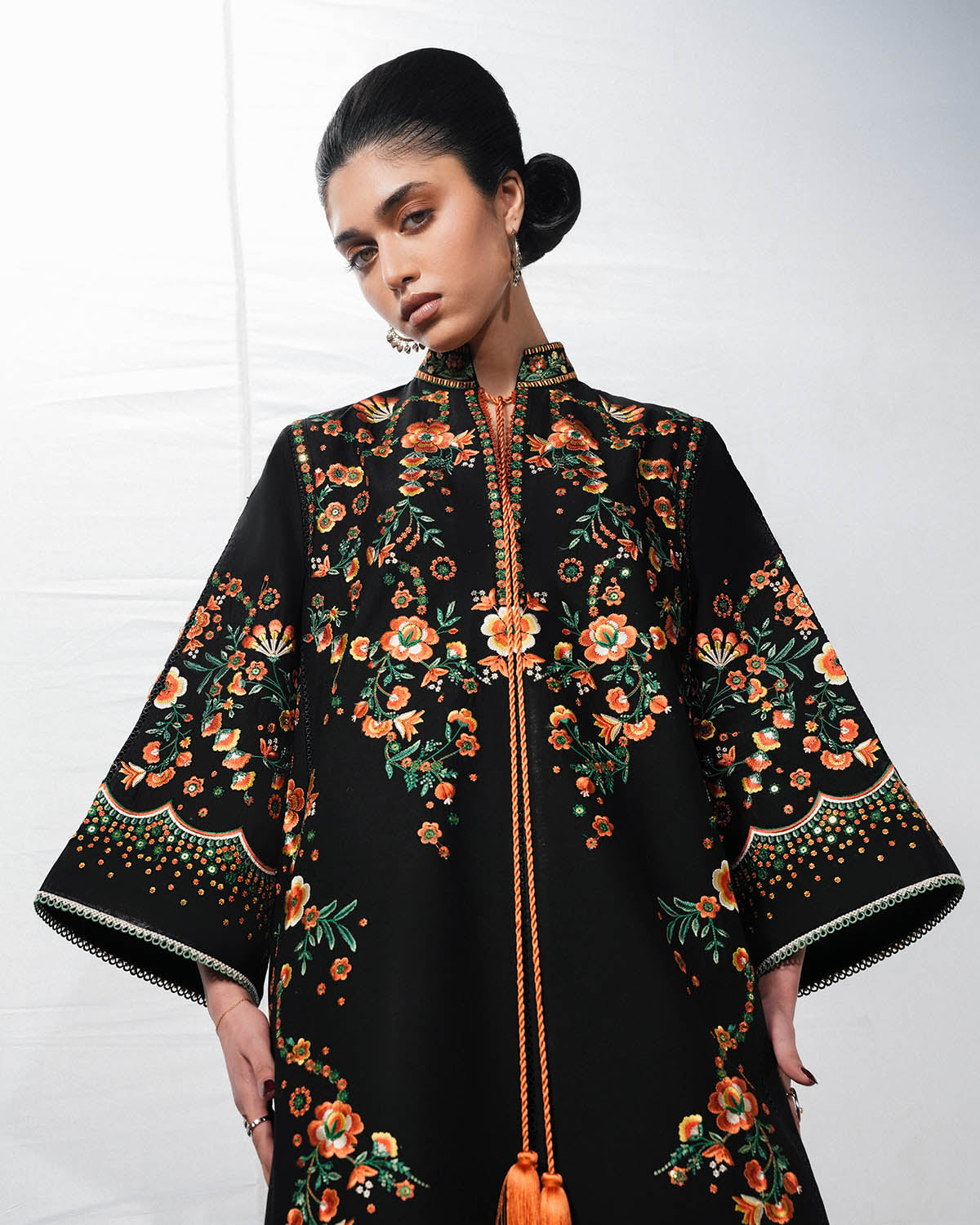 A long black shirt adorned with multicolor floral embroidery and subtle sequins is complemented by matching bell sleeves for a refined, graceful silhouette. It is styled with black dyed culottes featuring an embroidered border, while a digital printed silk dupatta adds a contemporary and elegant finish.