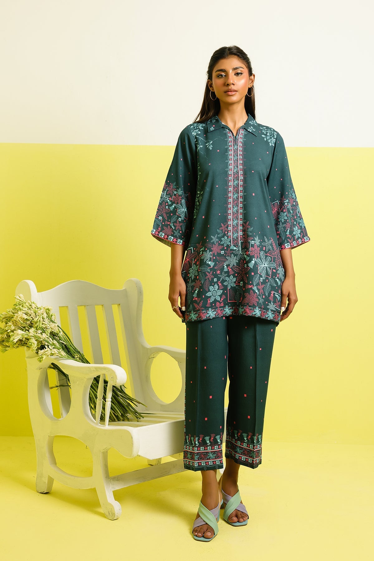 A two-piece teal green outfit consisting of a straight shirt and matching trousers. Features a collared neckline with a front placket, three-quarter sleeves, and a relaxed silhouette. It is adorned with floral running stitched impression prints in soft pink, and light green adorned around the hem, sleeves, and neckline.