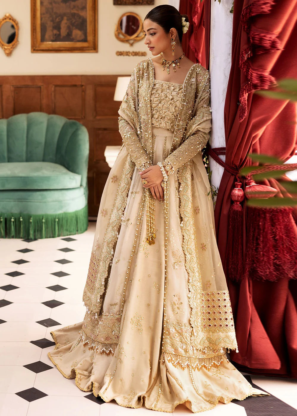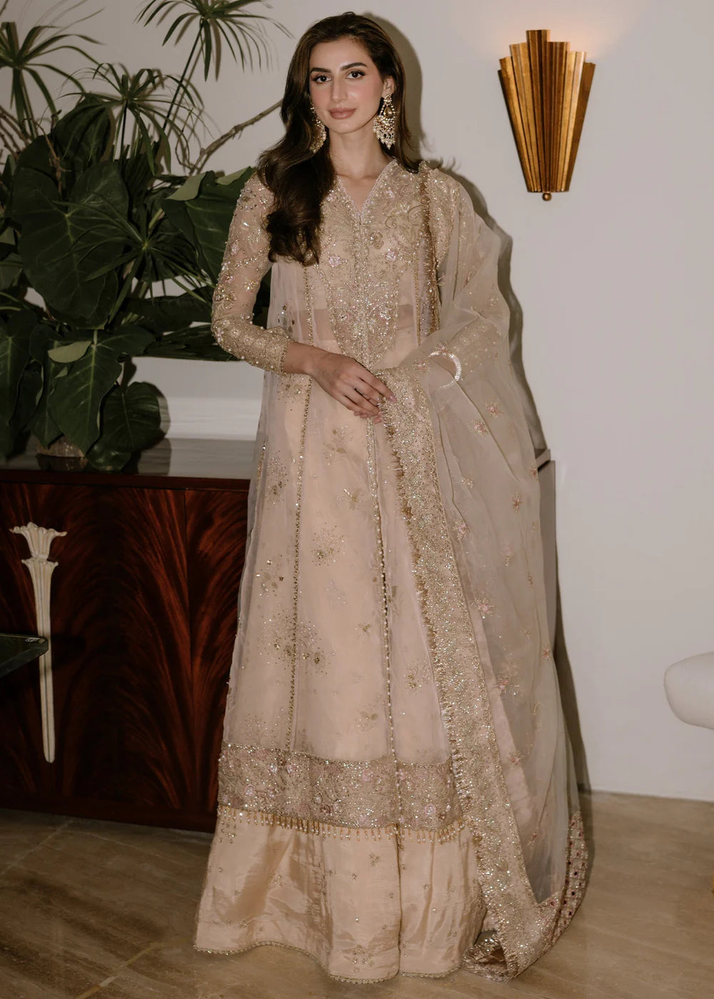 Purity and perfection come together in this floral based design that features a digitally printed organza gown with 3d crafting used to lift the base pattern. Offset with heavily crafted sleeves, a gorgeous neckline and border all detailed with hand embellishments design whispers everything soft , feminine and romantic.