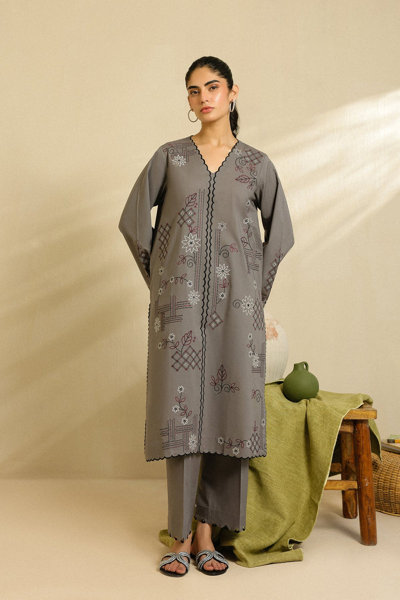 A grey long kurta adorned with all-over geometric and floral embroidery. Paired with plain culottes enhanced with scalloped detailing, this ensemble blends elegance with intricate craftsmanship