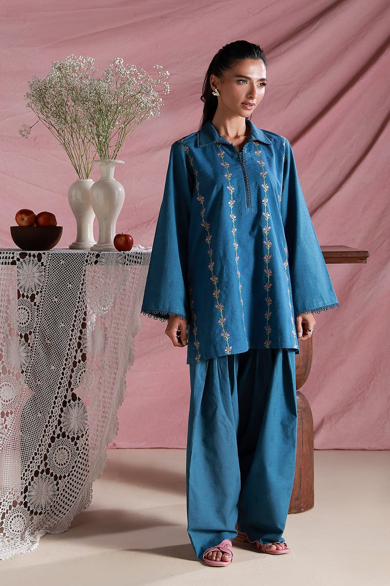 This blue two-piece outfit displays intricate linear floral embroidery across the shirt, accented with lace trims on the collar and sleeves. Finished with a big shalwar, it combines elegance with effortless comfort.