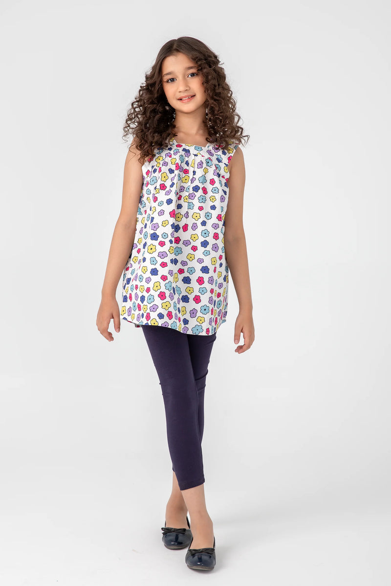 A garden of colors comes alive on this airy white cotton top, adorned with cheerful floral prints in yellow, blue, pink, and lavender. Ruffled wide shoulder straps and soft gathers add volume and comfort. A breezy, sleeveless style perfect for warm days filled with sunshine and smiles.